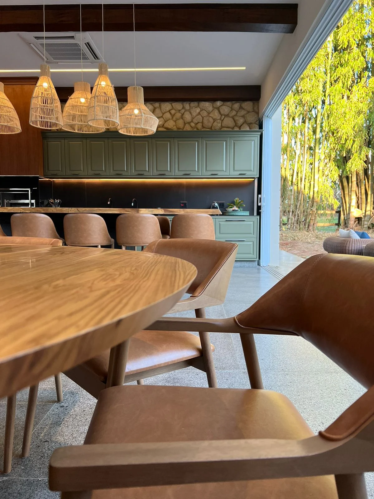 - Iluminação e Detalhes: O projeto é finalizado com uma iluminação que valoriza os acabamentos. O painel iluminado atrás da TV se torna uma obra de arte, enquanto as luminárias de palha suspensas na área gourmet conferem um toque artesanal e boêmio. Cada objeto, desde a mesa de centro de tronco rústico até o mobiliário, foi escolhido para compor um cenário onde o estilo e o conforto coexistem perfeitamente.