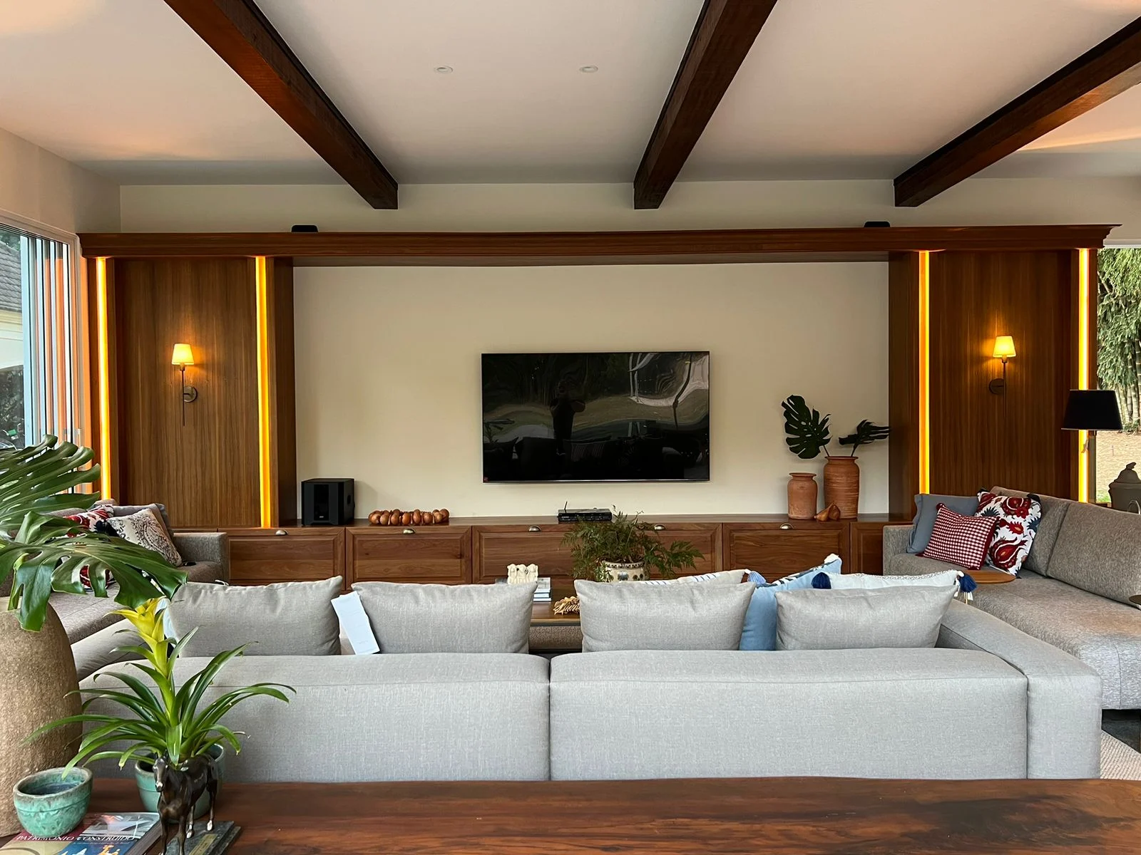 O Projeto Aurora é a materialização de um lar onde o luxo se encontra com a natureza. Em um ambiente integrado que une sala de estar, jantar e área gourmet, a elegância se constrói em cada detalhe. A marcenaria, feita com a nobreza da madeira maciça Cumaru e lâmina natural, não apenas serve a um propósito funcional, mas se torna a espinha dorsal de um design que irradia aconchego e sofisticação. Este é um espaço pensado para fluir, onde a transição de um ambiente para o outro acontece de forma suave e natural.