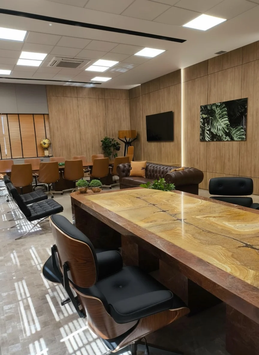 - Mobiliário de Destaque: A escolha de mesas e poltronas com design singular complementa o projeto. A mesa principal, com seu tampo em pedra de veios marcantes, e o sofá de couro Chesterfield trazem um toque de exclusividade e robustez, enquanto as cadeiras em couro preto garantem conforto e elegância.